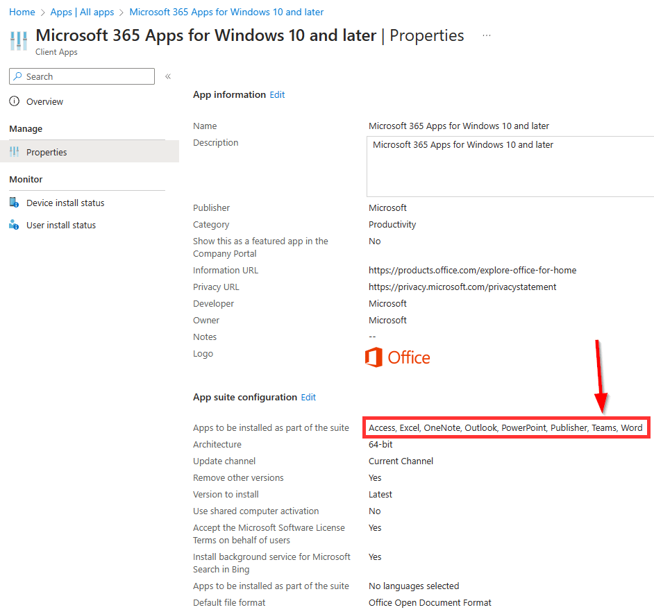 And inside the app you can see the products it is set to deploy. Here we can see the Teams install is part of this. What this actually installs is the Teams Machine-Wide Installer.