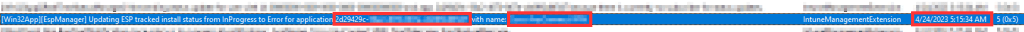 [Win32App][EspManager] Updating ESP tracked install status from InProgress to Error for application 2d29429c-XXXXXXXXXXXXXXX with name: APP-NAME.