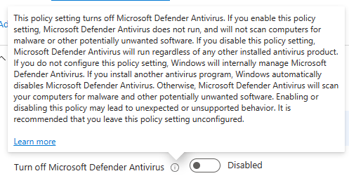 If you set this policy up in a production environment, I would guess your company has a 3rd-party solution you want to use and that’s why you tried to disable Defender. Simply put, Defender isn’t that stupid anymore. Nowadays it knows when you have a 3rd-party solution in place and automatically shuts itself off. That’s what you need to let happen.