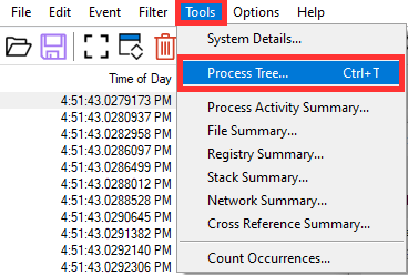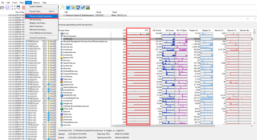 So, with that knowledge in mind, you might immediately go run a Process Explorer, go to Tools, and run a Process Activity Summary. This will show you the usage summary (including CPU) of the various processes that ran, and display that in an over-time format.