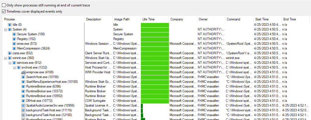 Here we can see the process that ran, the PID of that process, the lifetime*, and the exact command that executable was running with. Regarding the lifetime, bright green means it was still running at the end of the trace. Dark green means it stopped running before the trace completed.