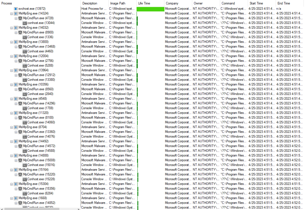 If you scroll down, you will find the MsMPEng.exe and MpCMDRun.exe over and over and over.