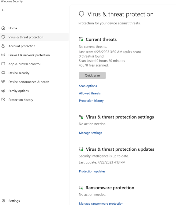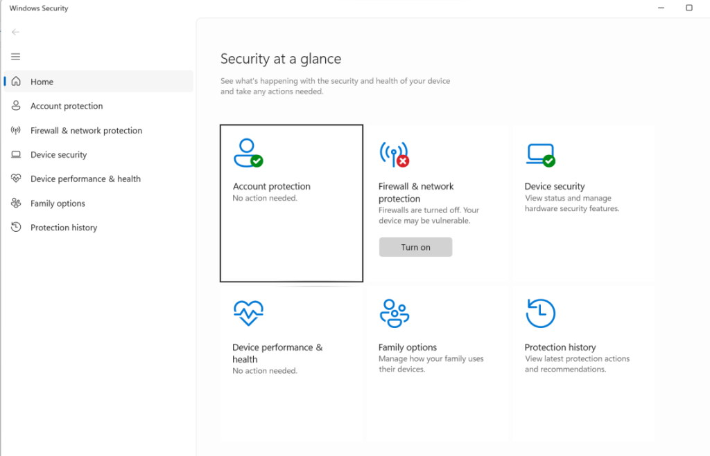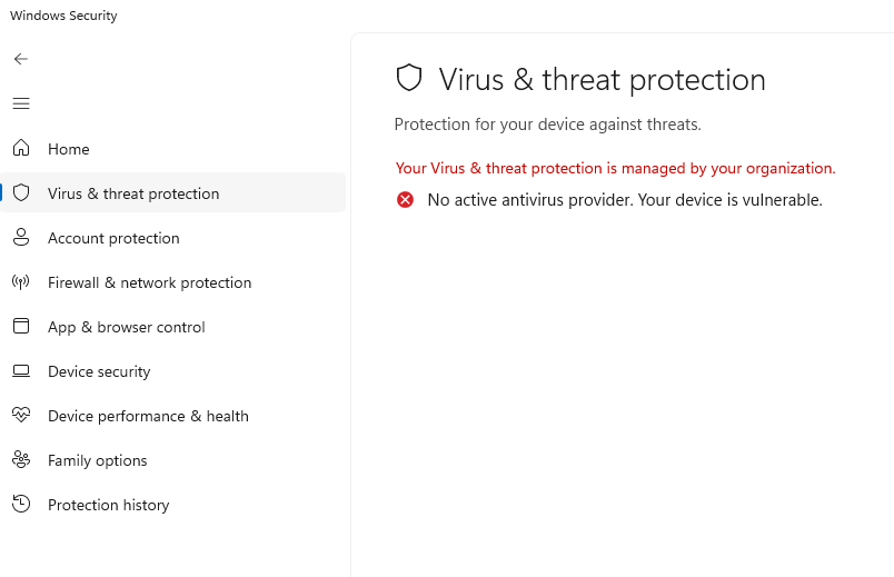 One time I even saw this. The “Virus and Threat Protection” tile, along with the option on the left were entirely gone.