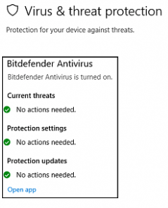 And this is what it looks like with a 3rd party AV enabled. Swap “Bitdefender” with whatever anti-virus you have. I managed to Google up a few of these screenshots and it appears they always appear the same minus the changing of the 3rd-party solutions name.