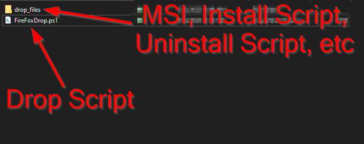 First, let’s talk about the structure of this package. At the root level, AKA the level you would want to point to when running the package utility, we have the FireFoxDrop.ps1 and a Drop_Files folder. Everything else is inside that Drop_Files folder.