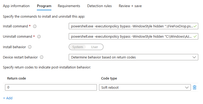 This is calling to the local uninstall that was dropped. Again, you could alter this to just a direct uninstall command if it’s simple. - Very importantly, you need to set the app to run off of return codes and you need to set code zero to a soft reboot. This is what makes the app always require a reboot and thus Intune not run detection until after that reboot.