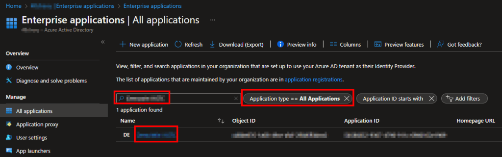 Then, change the filter to All Applications, search the name of your Function App just like we put into the script, and click on the result.