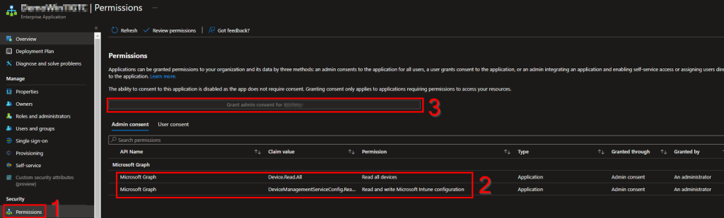 Next, we need to grant our Function App the permissions for Device.Read.All and DeviceManagementServiceConfig.ReadWrite.All such that it can make calls on its own to graph without any sort of App Registration or anything like that. This has to be done via a PowerShell script which can be downloaded here. You will need to be an admin on your machine to install the Graph module, and you may need to be a Global Admin to grant these permissions.