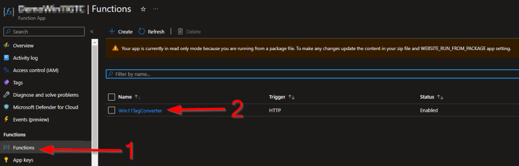 Head into your Function App and locate Functions on the left-hand side. This menu may take a moment to fully load. Then, click on the Win11TagConverter Function.