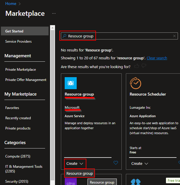 - Click the Create button on the bottom of the tile and choose Resource Group