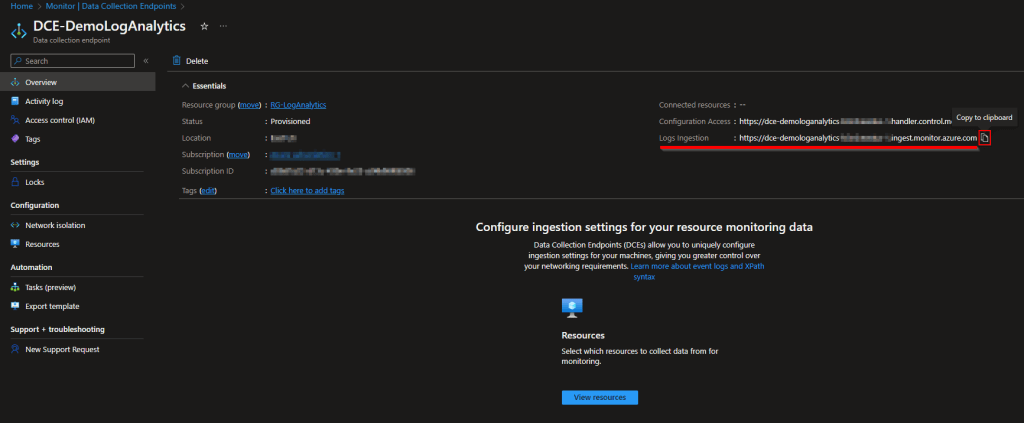 - And name the endpoint as you see fit. I will be using DCE-DemoLogAnalytics.