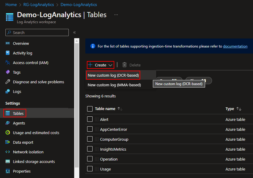 Look for Tables on the left and choose Create, New Custom Log (DCR-Based).