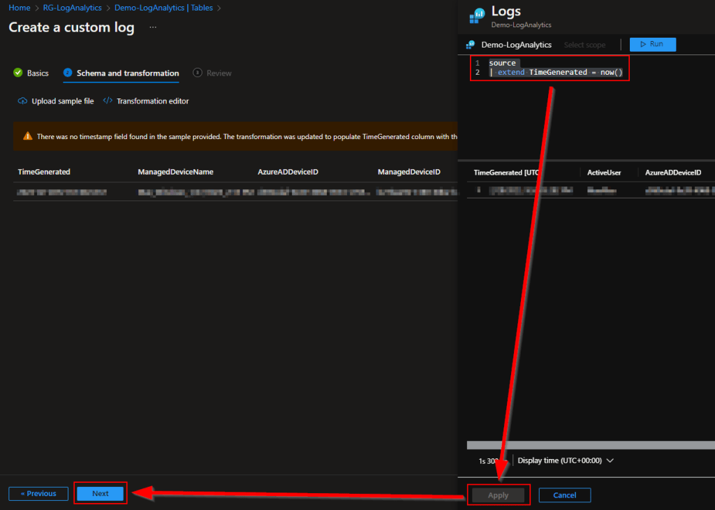 If for some reason it’s ever missing (it won’t let you click next and the warning will be red), click Transform Editor and drop this in. This marks the TimeGenerated column (the timestamp of the data) as the server’s time (UTC) of data ingestion.