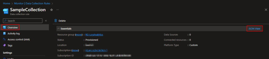 We have one last thing we need to do while inside the DCR. Change back to the Overview view and select the JSON view in the top right.