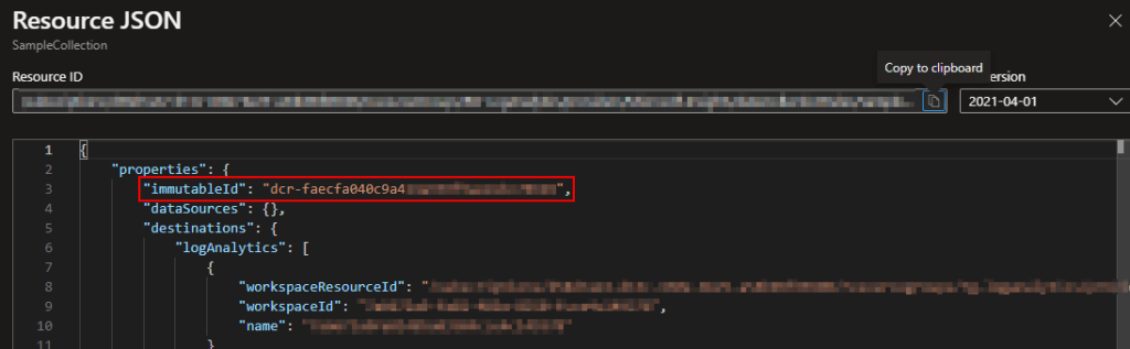 Next, look for an immutableId that should start with DCR-. Copy this somewhere safe as you will need it in the next step. This value is unique for every DCR.