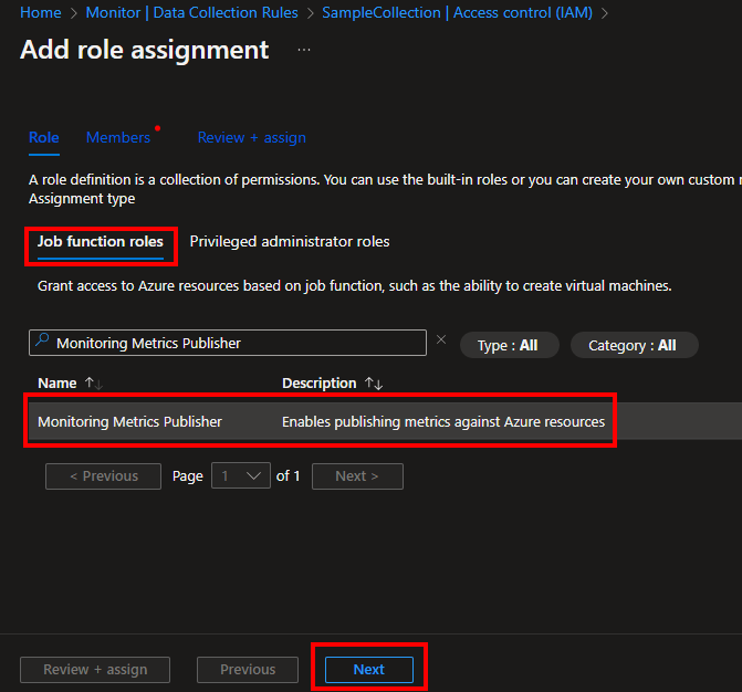 Make sure it is set to Job Function Roles, search for and locate the role Monitoring Metrics Publisher, and choose Next at the very bottom.