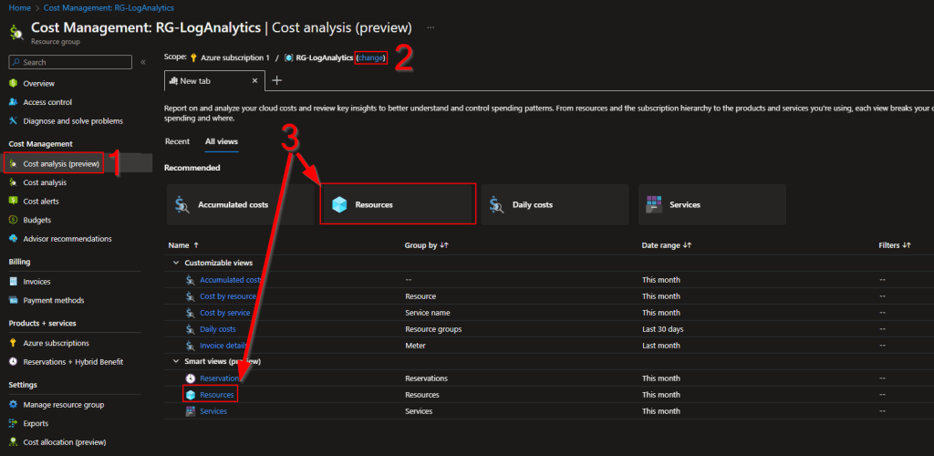 - You will need to set the scope (2) for your Subscription and Resource Group at the top. Choose the Resource Group housing your Log Analytics components.