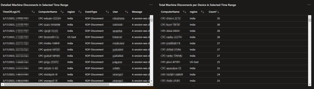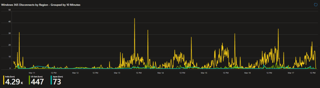 With this tool, you can see a 10-minute group breakdown of all the RDP disconnect events happening within the organization. Not only that, but those events are broken down by the region those devices live in. This way, you can look and at a glance determine when an outage has likely occurred or, what region that effected, or possibly what regions in general seem to be having stability issues.