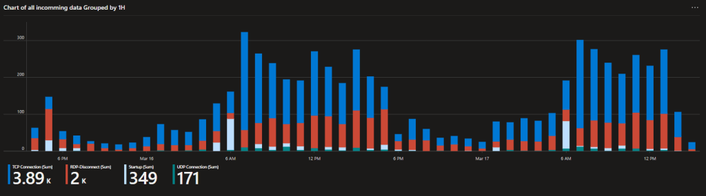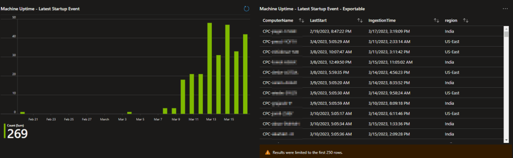 In depth knowledge: This field is a little more complicated than the others in terms of how it is collected. Logging/uploading reboot events themselves would be a problem given the default 30-day datapoint retention in Log Analytics. That would cause machines with over a 30-day uptime to simply fall off the chart. Instead, this calculates the uptime which is typically accurate to within a few seconds of the actual Windows event. The machine then always re-uploads that data-point whenever it has a TCP or RDP event to upload as well. Optionally, it can be configured to upload every time regardless of there being other events to upload although, that would cost more since you would ingest more. Specifics on how to control this will be in the setup section.
