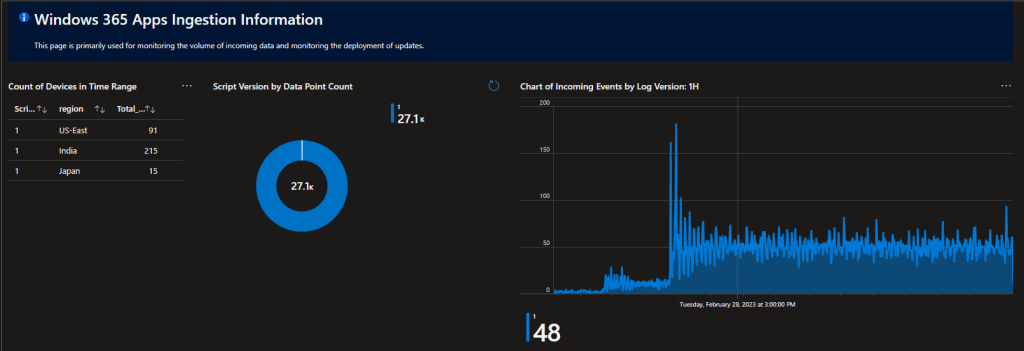 This workbook relies on a pair of tables, both of which come with a tab for monitoring ingestion, both by data point count and the version of the script in use. This helps you monitor that all devices are checking in, as well as with what version of the script was used to send that data. This is primarily used by administrators for monitoring the health of ingestion and update rollouts to the collection script itself.