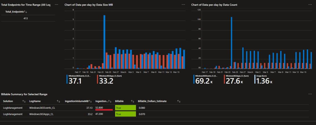 As you can see, so far in the past 30 days 400+ devices have managed to rack up a grant total of… $0.15 worth of ingestion fees. These queries only monitor ingestion fees though! If you don’t know what that means, that’s why you should read the generic serries such as the cost section.