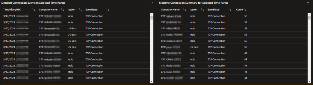Of course, just like the previous data, there is an individual event breakdown and summary breakdown. This includes both a log for every event on every machine, as well as a summary by count & connection-type by machine.