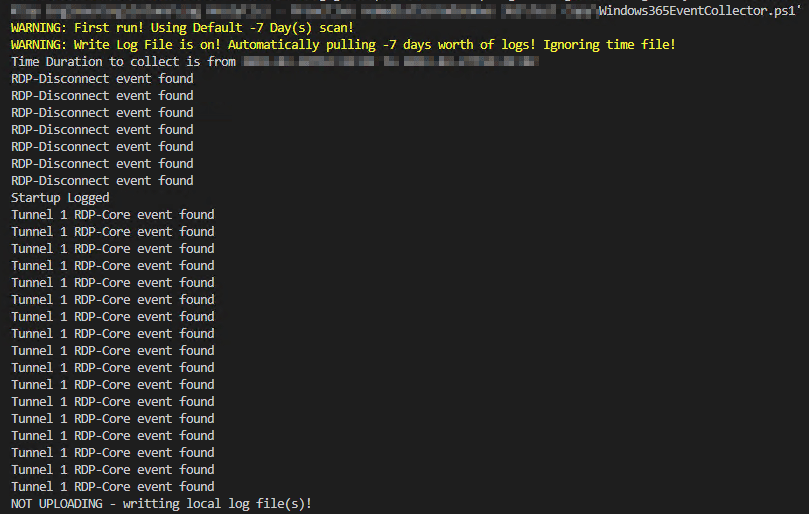 One last thing before we execute them. Go to C:\Windows\LogAnalytics (this exists now and is hidden) and delete the windows365EventCollector.txt file inside it. That text file will exist assuming you’re now running these on the same station used to generate sample data. This is the marker file used to determine event collection ranges. If we had left it, the station would have only collected events from the time in that marker file when we generated sample data to now. by deleting it, it will think it’s a first run again and pull a full 7 days (by default) back in time and upload it.