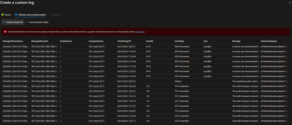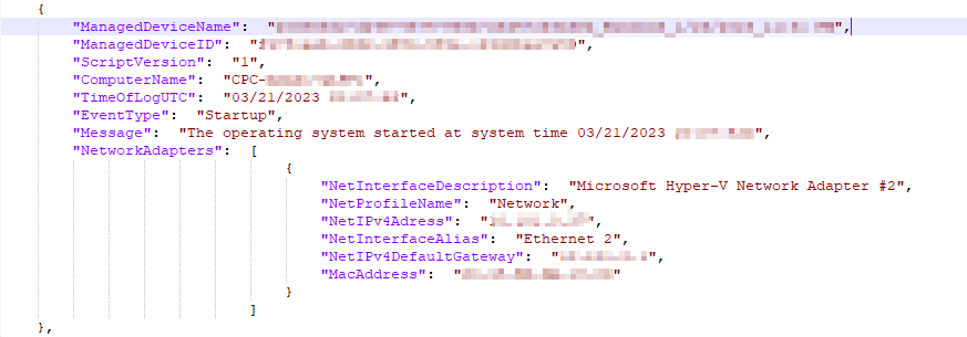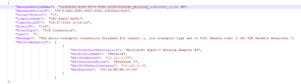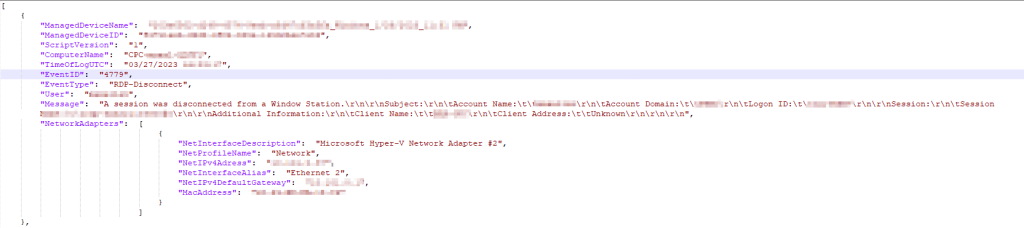 This file should have a multitude of entries detailing Windows events. Again, you should have at least one entry for all three kinds of events. RDP-Disconnect, Startup, and TCP (or UDP) Connection. Since I know these pictures compress a good deal, below you will find how each single event will look one-by-one. You should see that each entry contains event information as well as information about the device including its Intune ID, Intune Management Name, and network information. You should see all the same information filled in that I do.