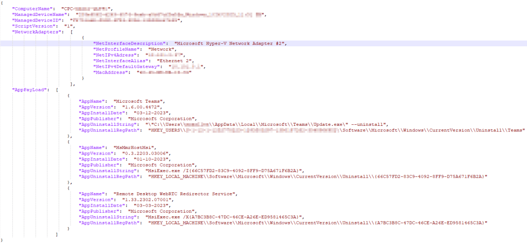 This one is a bit more complicated. Like the other RAW you will see an entry for the Computer Name, Intune ID, Intune Management Name, and Network Adapters. Differently, there should be an array named AppPayLoad containing various entries for the apps on your machine which details the Name, Version, Install Date, Publisher, Uninstall String, and Uninstall Path. This should contain whatever apps you saw in the script output originally which will typically be just three of four possible.