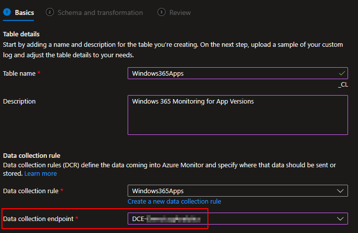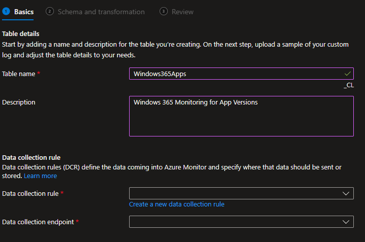Note: If you previously followed V1 of the Windows 365 guide, you do NOT need to redeploy your Tables and DCRs. Just create the new Function App and in this article we will grant it permission to the same DCRs you already have.