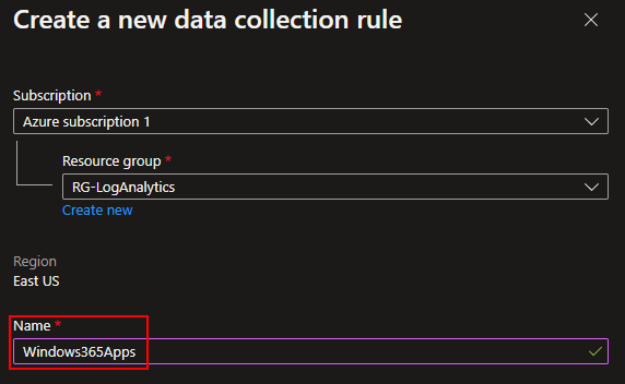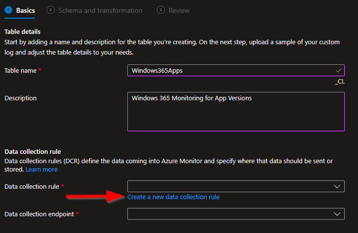 You then need to choose Create a new data collection rule. I would recommend you ALWAYS make a new DCR for every table.