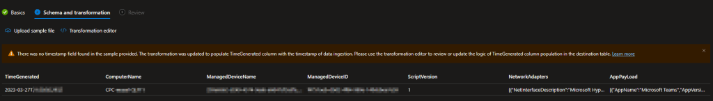 Assuming your data looks good, you’re now ready to use the two RAW.JSON files as sample data such that you can create your DCR and tables. If you need an in-depth guide on this, refer to this blog post. That said, I will still provide a fair number of details here.