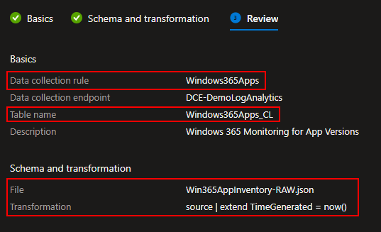 You will then see a confirmation of what you are creating. You should again see the DCR is named after the Table, the Table Name will now show it’s automatic _CL, the file you used should be the corresponding RAW file, and your TimeGenerated should be now().