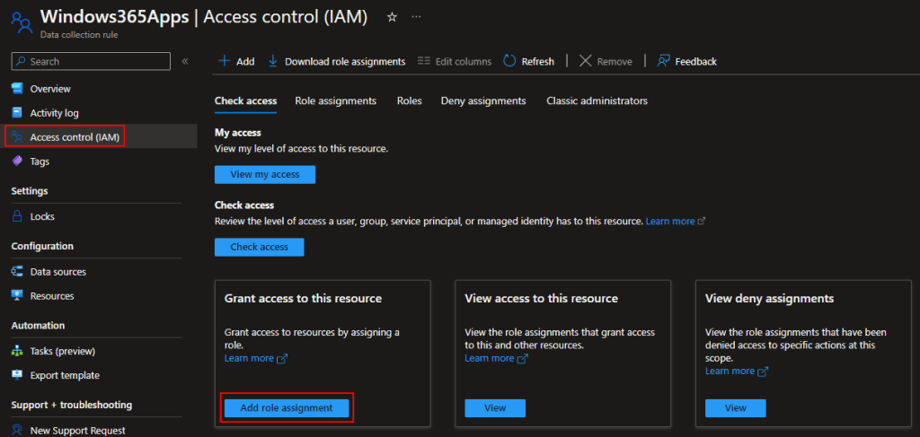 You need to then go into both the new DCR’s, go to Access Control (IAM), and Add Role Assignment.