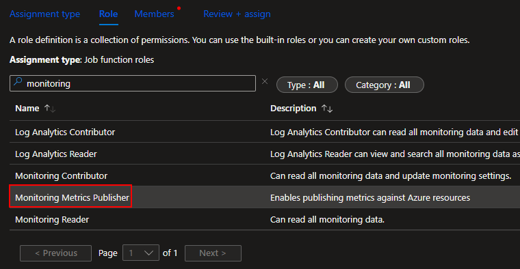 Search and select the Monitoring Metrics Publisher role and press Next.