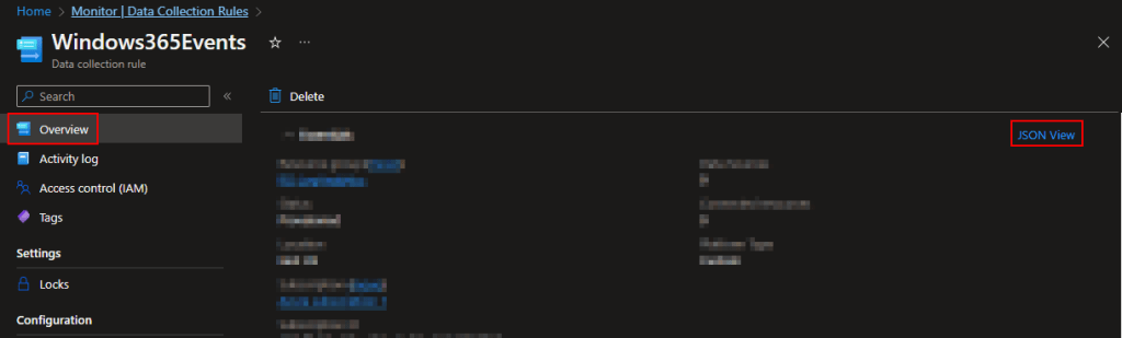 Still inside the Monitor menu and inside our DCR’s, go to the Overview and choose JSON view on the far right.
