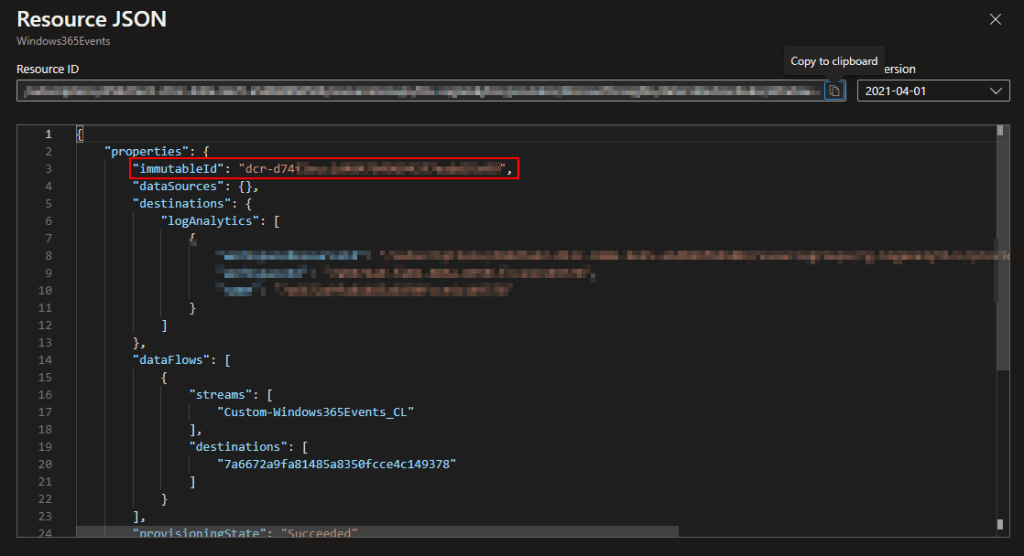 - Into $DcrImmutableId (or rather the quotes next to it) drop the ID’s we just gathered. Obviously, the event DCR ID goes in the Event Collector Script and app DCR ID into the App collector script.
