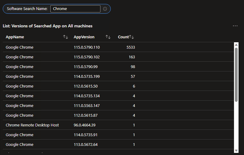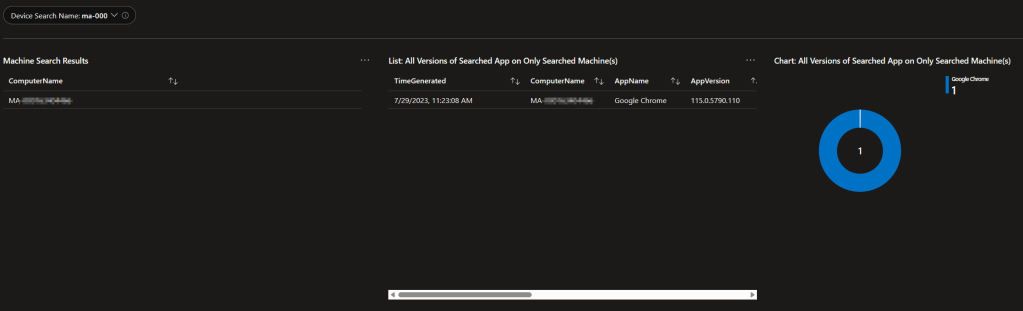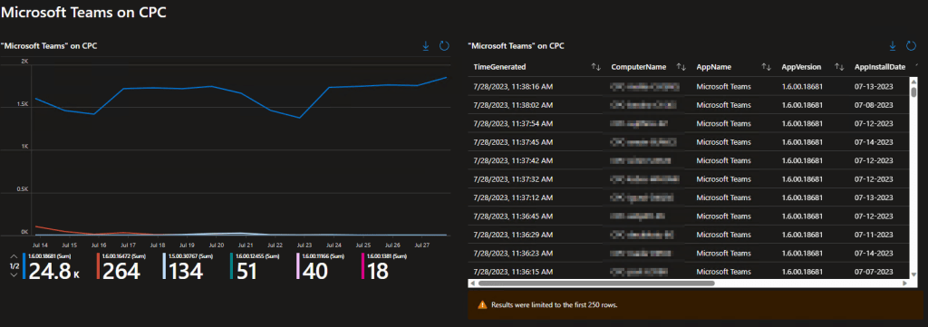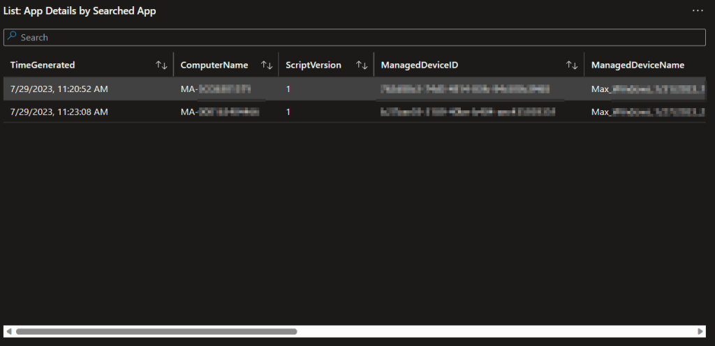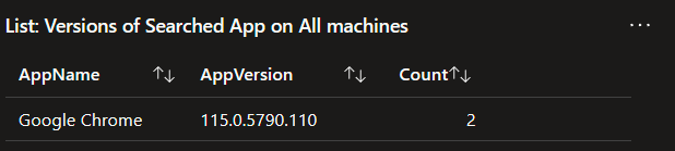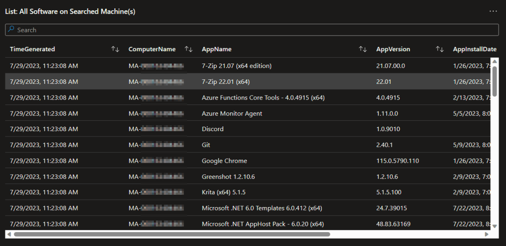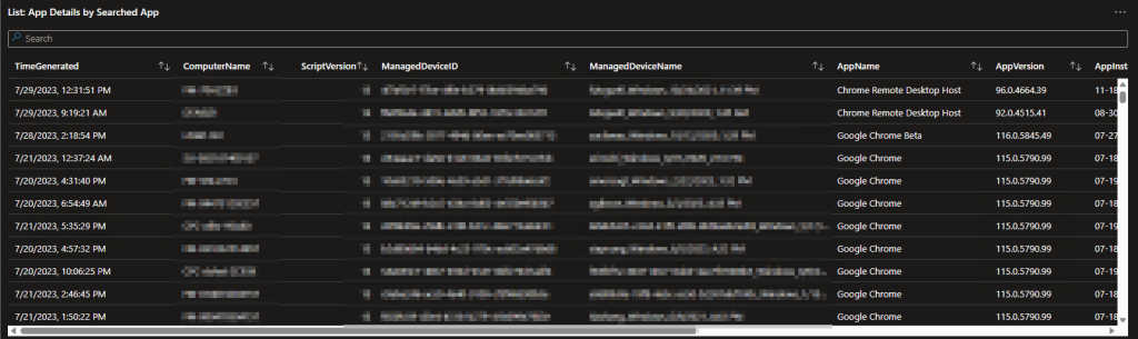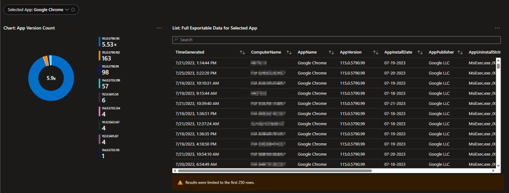Obviously, when you spot a line indicating some devices are way behind, you’re going to want to know who that is. This query provides and exportable table of all the details including the time the data was received, the computer it came from, the version of the script used to provide that data, the Managed Device ID, Managed Device Name, App Name, App Version, App Install Date (if it has one, not all apps do), Publisher, Registry Uninstall Path, and App Uninstall String.