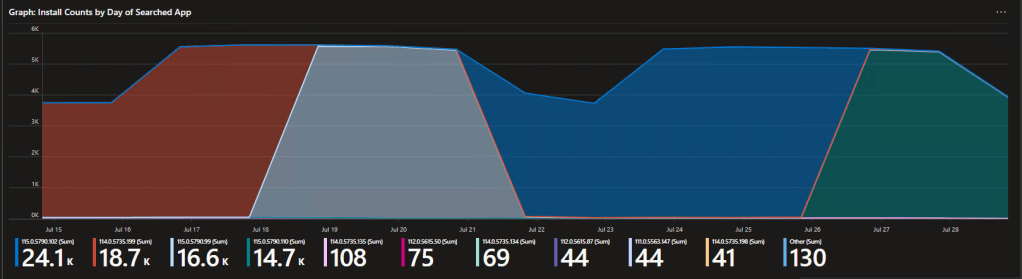 Here we can see Chrome has rolled out 4 recent updates. The color for the old version subsides and the new version takes over. That dip in the middle is a weekend, as not as many devices are online to report in over weekends, thus the total amount of X version seen those days went down.
