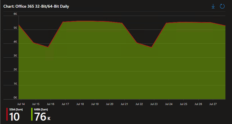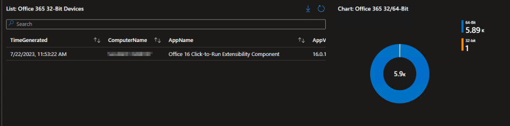 We have a list of what devices have 32-bit Office, as well as a breakdown in the org of 32 versus 64 bit.