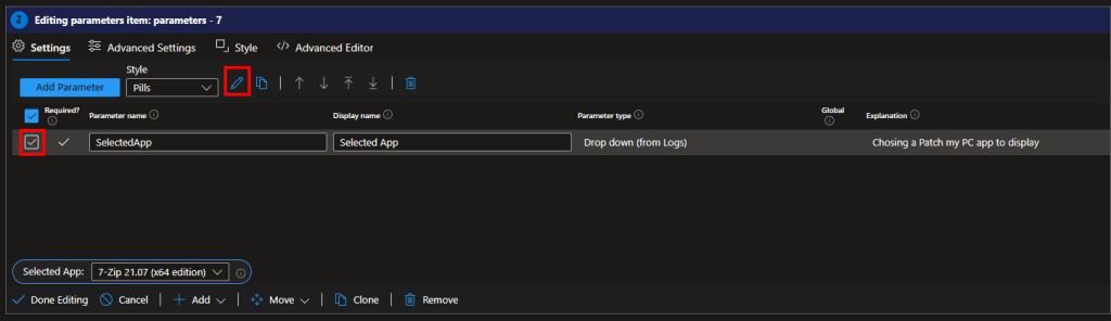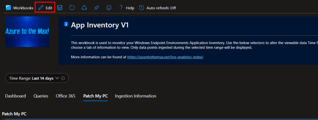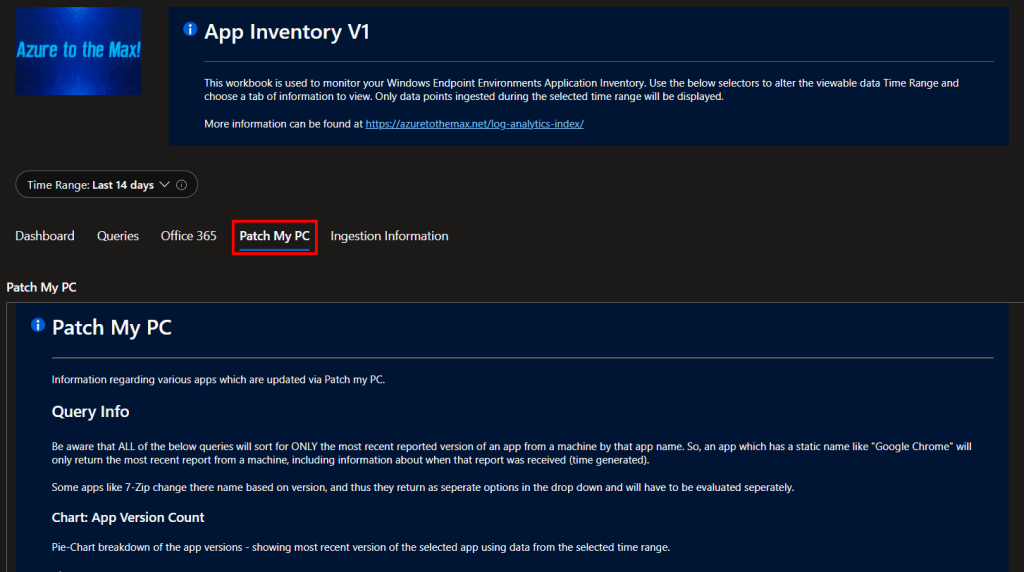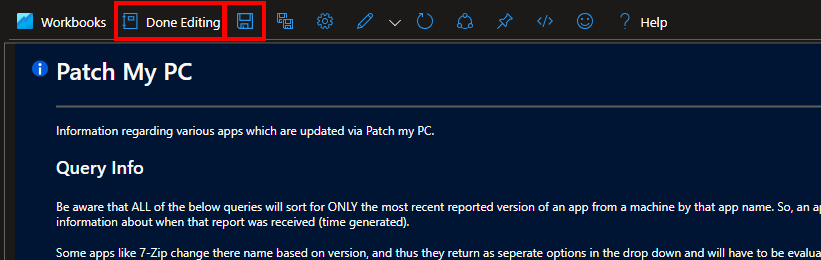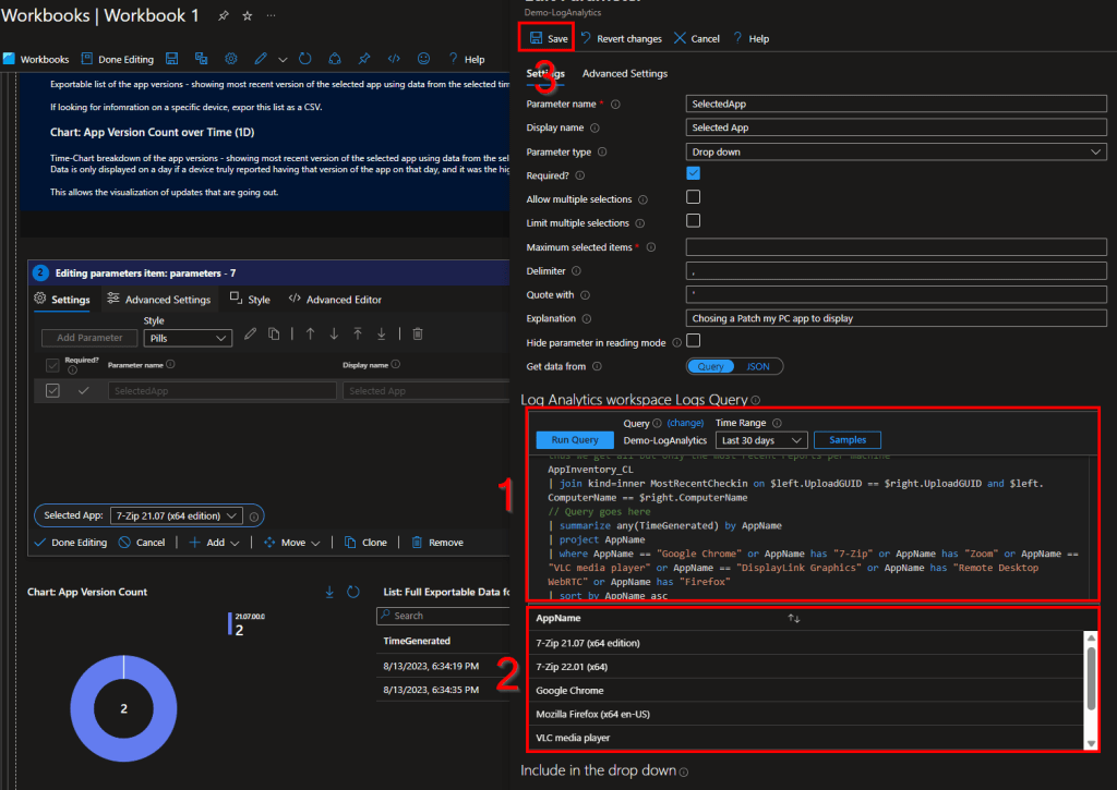 I need to give some background here. There is a Patch my PC page built to monitor your Patch my PC apps. Unfortunately, as I mentioned in the overview series, the endpoints themselves have no idea what app is and is not from Patch my PC. So, we can’t ingest a data point that tells us that. Instead, we have to tell Log Analytics what apps are and are not from Patch my PC manually. This is done via a query that then controls the output of a drop down selector. As such, you have to manually edit that query and add the names of all your apps that your Patch my PC is doing – granted you don’t have to be exact. I can better explain what I mean by that if I show you.