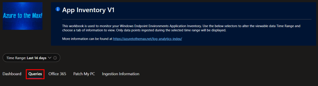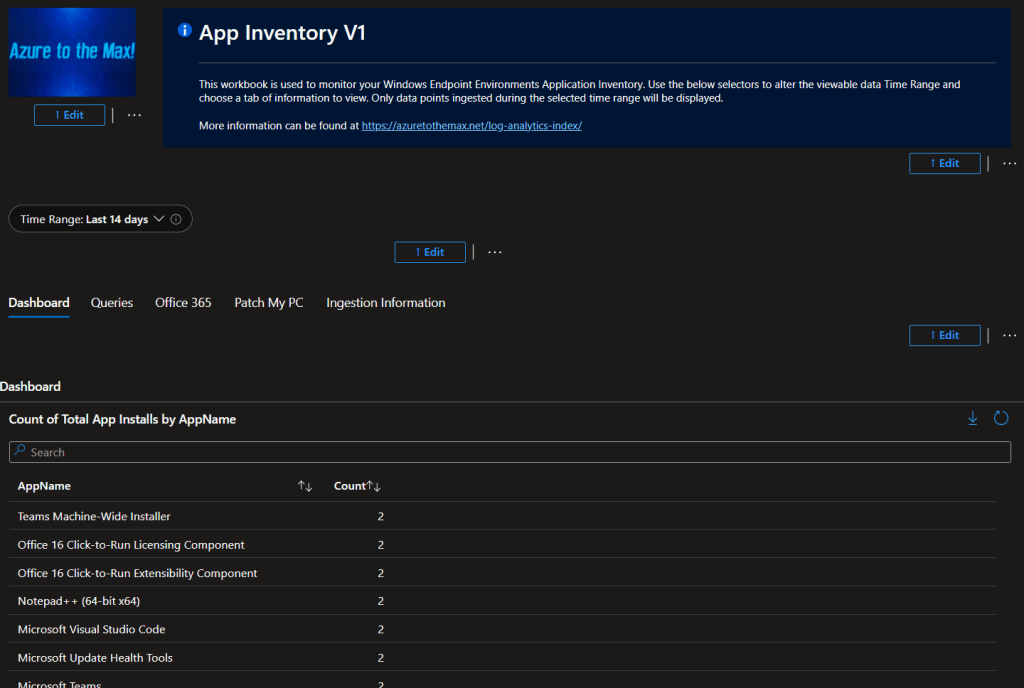You should now have your application inventory workbook up and running as well. Feel free to explore around it. Information on what all these queries are is in the original opening articles covering what the collector collects. Additionally, most every query has an info panel in the workbook itself to explain what it does as well.