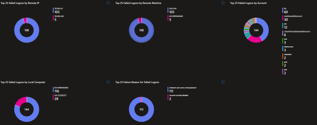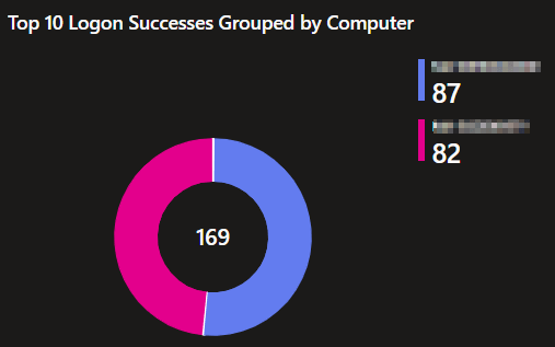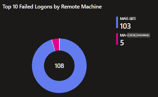This pie chart displays the top 10 remote Machines responsible for authentication failures. Again, this happens for network events like RDP logins, accessing C$, remote management, etc.