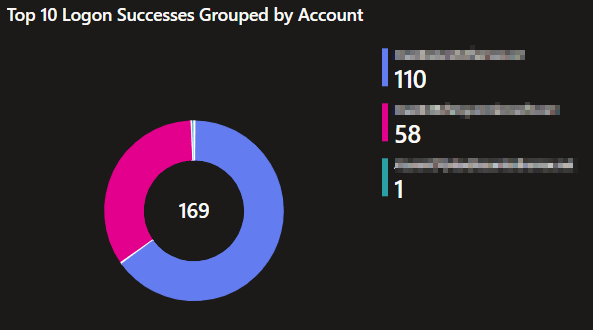 This pie chart displays the top 10 account names responsible for authentication successes. This helps identify what accounts are, for reasons not necessarily good or bad, authenticating the most.