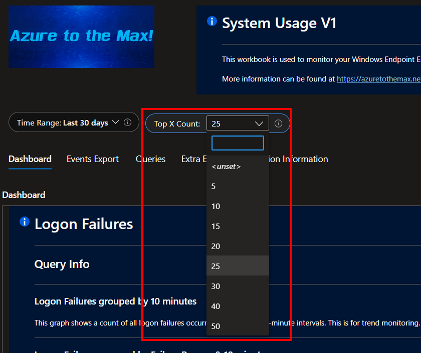 Like always, the time range for ALL data used in all queries of all pages is controlled by a time selector at the very top of the workbook.