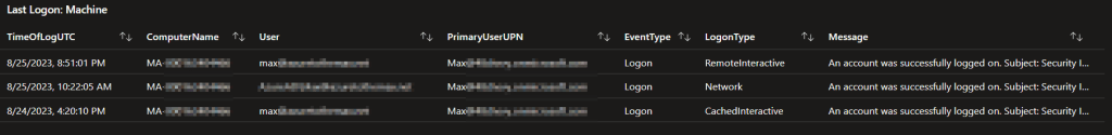 This query shows the most recent successful authentications to a machine by a given user and logon type. So, if you search up the X-important-persons machine, you can see all the accounts that have authenticated to that device in the selected time range by when they most recently authenticated. It will also further break it down to show multiple kinds of logon types if such events exist.