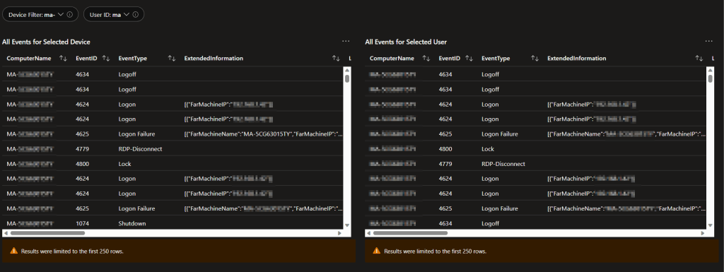 Much like the above section, this query aims to provide all information on all events received. The difference is that this one aims to provide that information for just the searched device(s). This includes the time of the log, computer name, event ID, event type, extended information (where remote IPs and names are kept, details in next article), logon type (if applicable), managed device ID, managed device name, the full event log message, the user, and time generated (time of log upload).