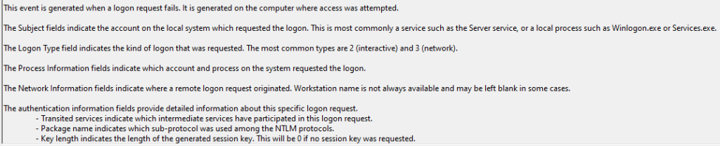 This process is reliant on DNS or NetBios. If your environment doesn’t have these working, this value will never gather. - These events contain a “Failure Reason” code which is supposed to translate to why the attempt failed. For example, “Unknown username or bad password” and “Account currently disabled.”
