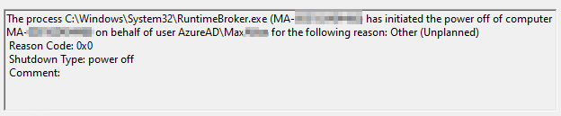 No filtering is performed on shutdown/restart events. However, again, we do translate the type of shutdown (restart or power off) into a more human-friendly data point. Additionally, these events do often capture the leading AzureAD\ or domain\ and you could easily at a trimstart to remove that if you wanted to.