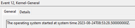 This log comes from the System log and we actually have to further narrow it to events with the source provider of Microsoft-Windows-Kernel-General as other events share ID 12. This is an indication of the system starting. This will never have an associated account as the OS has no idea what account/human triggered it to start. That’s like asking for an OS level log of who pushed the power button.